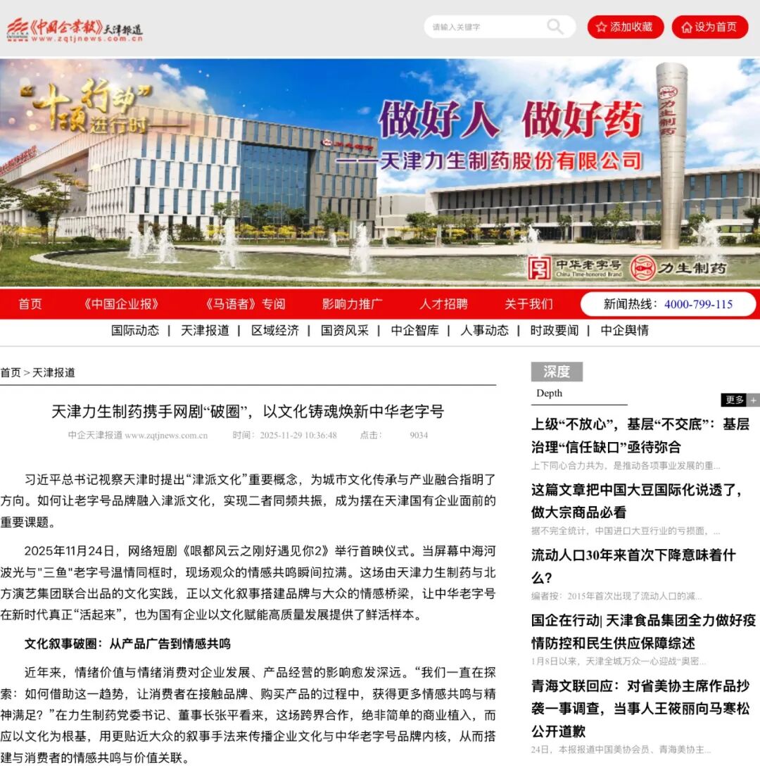 编者按:近日,《中国企业报》刊登《天津力生制药携手网剧“破圈”,以文化铸魂焕新中华老字号》,讲述力生制药以文化叙事搭建品牌与大众的情感桥梁,让中华老字号在新时代真正“活起来”,也为国有企业以文化赋能高质量发展提供了鲜活样本。习近平总书记视察天津时提出“津派文化”重要概念,为城市文化传承与产业融合指明了方向。如何让老字号品牌融入津派文化,实现二者同频共振,成为摆在天津国有企业面前的重要课题。2025年11月24日,网络短剧《哏都风云之刚好遇见你2》举行首映仪式。当屏幕中海河波光与"三鱼"老字号温情同框时,现场观众的情感共鸣瞬间拉满。这场由天津力生制药与北方演艺集团联合出品的文化实践,正以文化叙事搭建品牌与大众的情感桥梁,让中华老字号在新时代真正“活起来”,也为国有企业以文化赋能高质量发展提供了鲜活样本。文化叙事破圈:从产品广告到情感共鸣