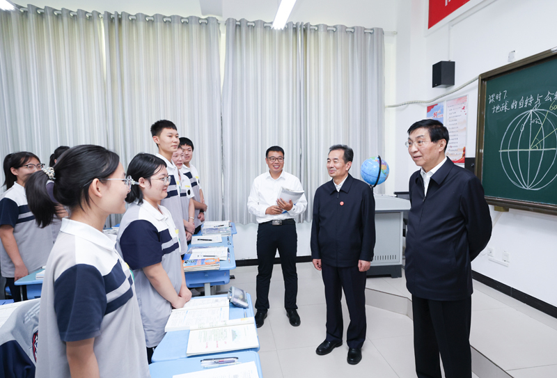9月25日下午,受习近平总书记嘱托,中共中央政治局常委、全国政协主席、中央代表团团长王沪宁带领中央代表团部分成员在巴音郭楞蒙古自治州库尔勒市看望慰问当地各族干部群众。这是王沪宁和中央代表团部分成员在库尔勒市第二十三中学考察教育援疆情况。新华社记者 姚大伟 摄