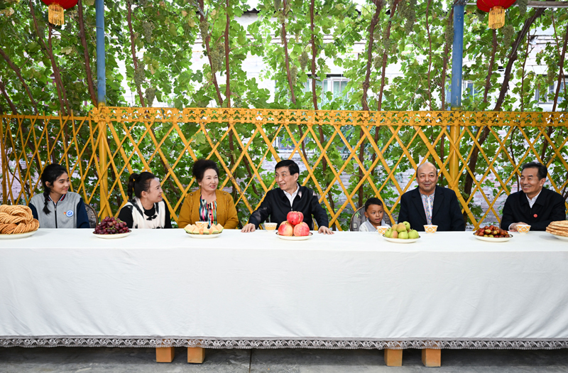 9月25日下午,受习近平总书记嘱托,中共中央政治局常委、全国政协主席、中央代表团团长王沪宁带领中央代表团部分成员在巴音郭楞蒙古自治州库尔勒市看望慰问当地各族干部群众。这是王沪宁和中央代表团部分成员在库尔勒市阿瓦提乡吾夏克铁热克村了解乡村产业发展和群众生产生活情况。新华社记者 张领 摄