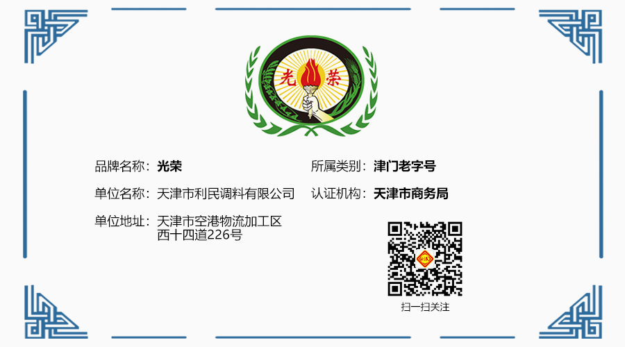 “光荣”是天津辉煌历程中流淌的城市血脉,与天津共筑八十年坎坷沉浮与涅槃式的辉煌。独特的天津文化底蕴,为光荣酱油走向品牌化、特色化奠定坚实根基。利民人肩负着强烈的民族使命和社会责任,有义务将曾经代表着天津调味美食的光荣酱油,再一次回归天津人民心中,重新唤起天津人引以为傲的光荣梦想。