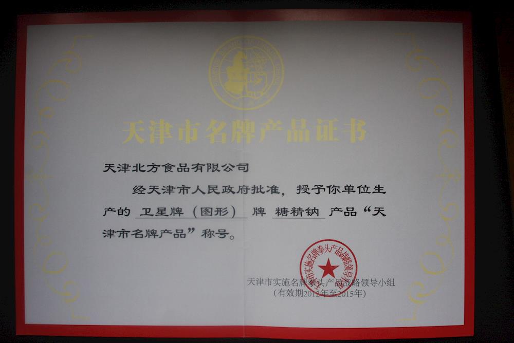 2012—2015年:天津市实施名牌拳头产品战略领导小组授予“卫星牌”糖精钠天津市名牌产品荣誉称号。